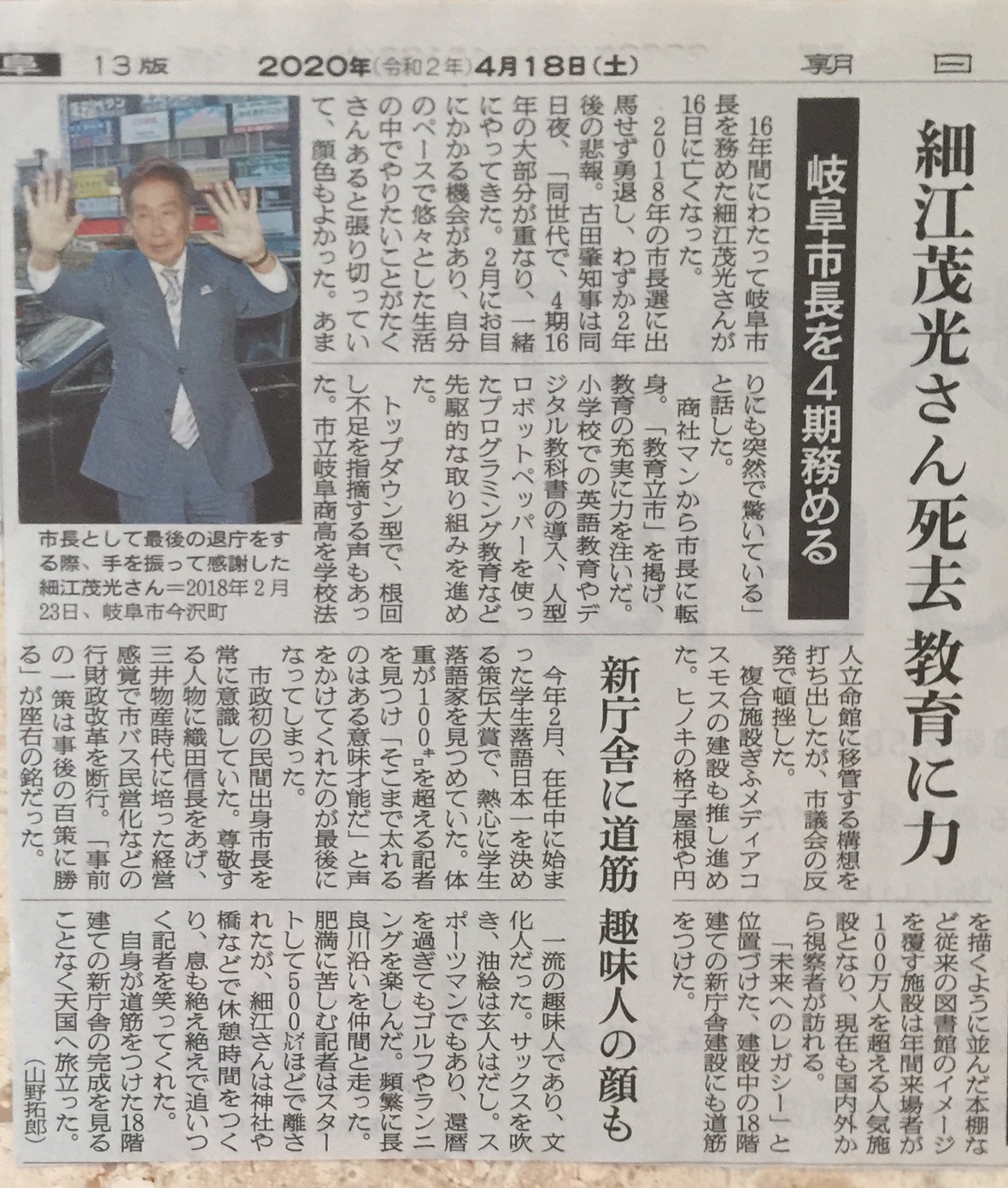 細江氏は岐阜市長を4期16年務められ、その間当会の名誉顧問を務められました。氏は「教育立市」を掲げ、英語教育を推進し、小学校での英語教育やデジタル教科書の導入、人型ロボットペッパーを使ったプログラミング教育など先駆的な取り組みを進められました。ご冥福をお祈りいたします。