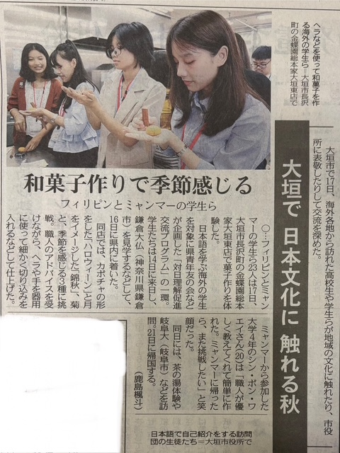 訪日団は,岐阜県に10月16日から20日にかけて滞在し 、岐阜県庁を表敬訪問したほか、三輪酒造の見学、和菓子作りや茶の湯の体験、岐阜大学での学生交流を行い、更に、2泊3日のホームステイを行い、